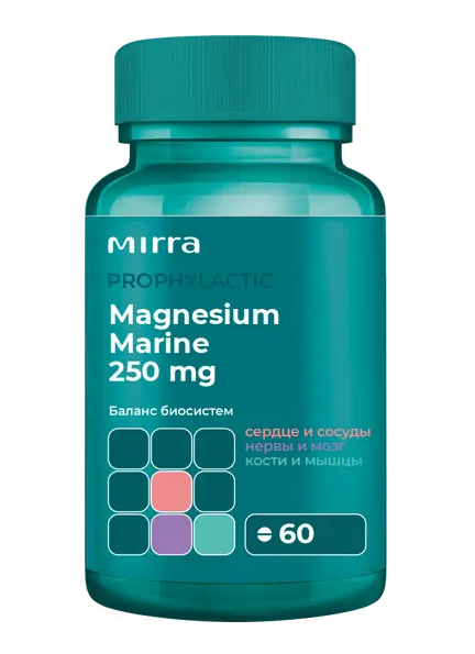 Магний — важный элемент для здоровья нервной и сердечно-сосудистой систем. БАД «Мирра-Магний» содержит в суточной дозе (2 капсулы) 250 мг оксида магния морского происхождения (в т. ч.137 мг биодоступного магния) и 4 мг витамина В6 для лучшего усвоения. Снижает эмоциональное напряжение, поддерживает работу сердца и мозга. Рекомендуется для мужчин и женщин.